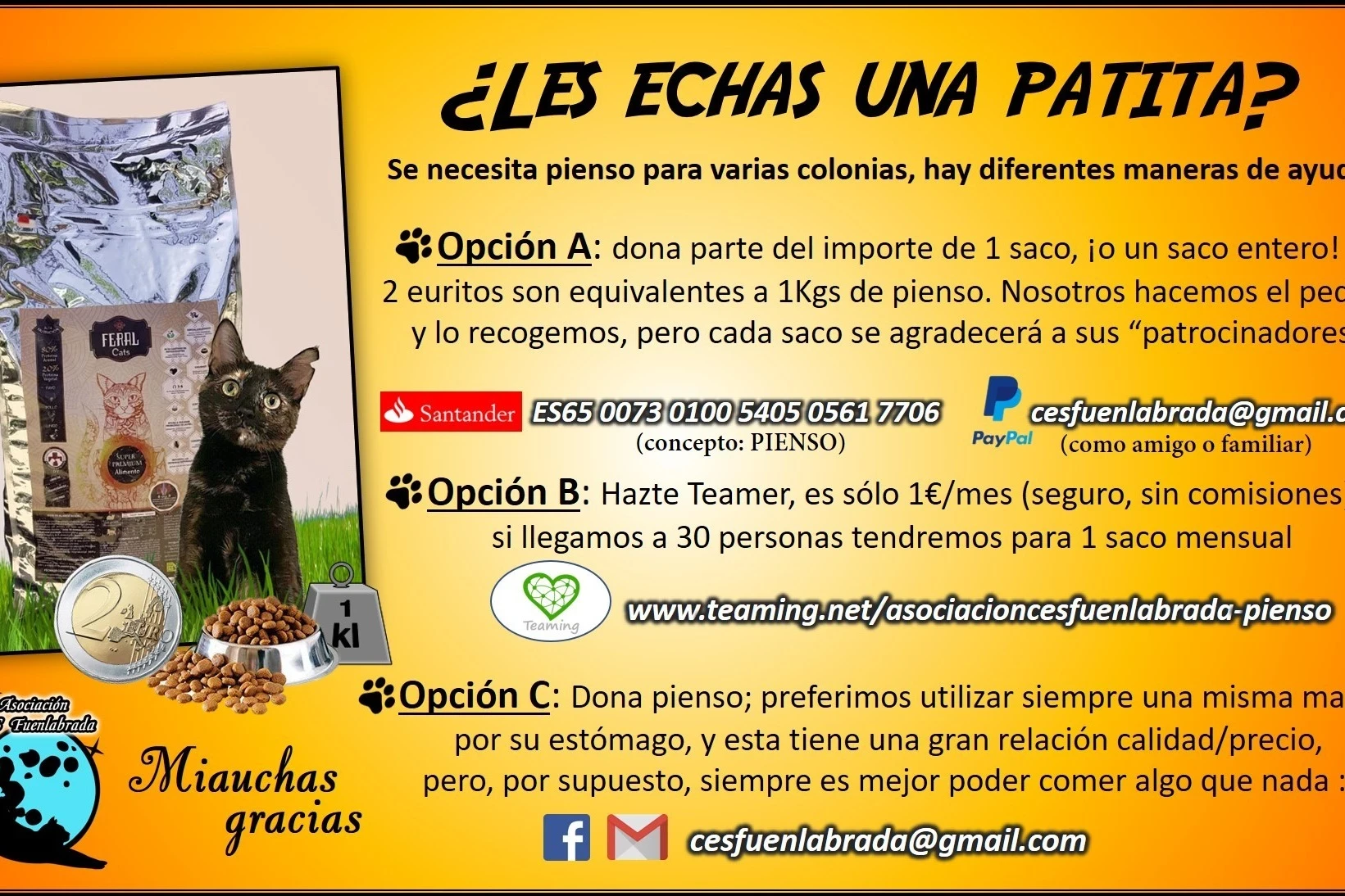 Somos un pequeño grupo de personas amantes de los gatos, en su mayoría gestoras de colonias, que viendo la mala situación de éstas en nuestra ciudad, nos hemos organizado para ayudarles de forma más coordinada y eficaz. Nuestro objetivo principal es el control de las colonias (CES/CER) que aún están descontroladas, para asegurar el máximo bienestar de los gatos, y mantener en buenas condiciones las ya controladas (pienso de calidad, desparasitaciones etc). Aparte, en la medida de lo posible, ayudamos a gatis abandonados, enfermos o peques en peligro. Se agradece cualquier ayuda (casas de acogida, difusiones, etc.). Para cualquier donativo puntual, sorteo, ventas solidarias, etc. nuestra cuenta es Openbank ES65 0073 0100 5405 0561 7706, Paypal [email protected] (como familiar o amigo porfa). https://www.teaming.net/asociacioncesfuenlabrada (para gastos vet, mat captura) https://www.teaming.net/asociacioncesfuenlabrada-pienso (para alimentacion) mail y paypal [email protected]